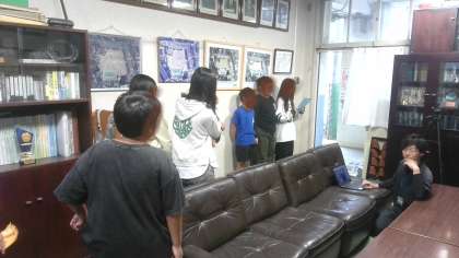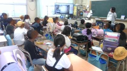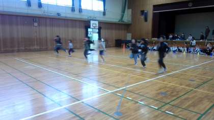 今日のフレンド集会は、運動場組は各活動教室に分かれてteamsでクイズを、体育館組はリレーあそびをしていました。
