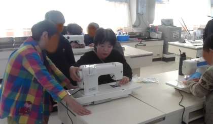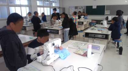 家庭科の学習です。裁縫実習でミシンの使い方を実習していました。ミシンを使って、練習用布の縫い目や線などに沿って縫っていっていました。なかなかまっすぐ縫えなかったりミシンの動きに合わせて布を動かすことがうまくできずに糸が切れてしまったりと、苦戦している子もいました。