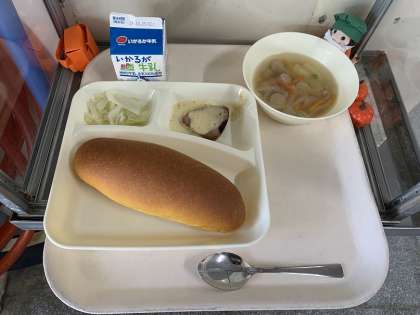 今日の献立は、カツオのガーリックソースかけ、ウインナーとジャガイモのスープ、キャベツのサラダ、パンプキンパン、牛乳でした。ごちそうさまでした。