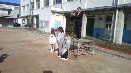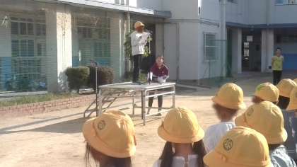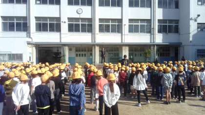 今日の全校朝会は、「100年後の住吉区」絵画展表彰者の紹介や委員会からのお知らせなどがありました。