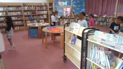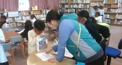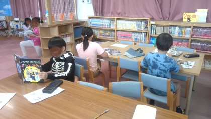 図書の時間です。今週は読書週間で、図書委員会から図書クイズが出ています。そのクイズに挑戦する子、本を読み始めている子など様々でした。