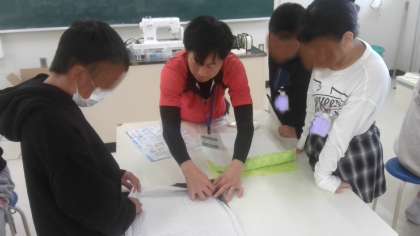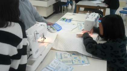 家庭科の裁縫実習です。ナップザックづくりを頑張っていました。布を二つ折りにして、両端をミシンでまっすぐ縫って袋状にしてナップザックの原型を作っていました。