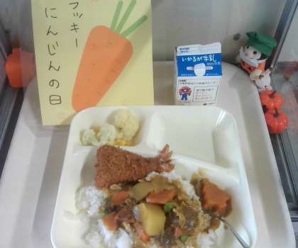 今日の献立は、エビフライカレーライス、カリフラワーのピクルス、豆昆布、牛乳でした。今日のラッキーにんじんはツリーでしたね。
