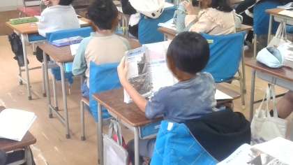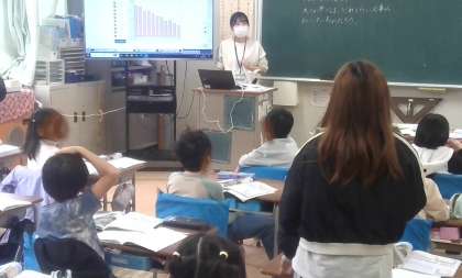 社会科の学習です。大阪市の防災について考えていました。大阪市内の火事件数の推移について教科書の資料を基に減少傾向にあることをとらえ、その要因について意見交換していました。