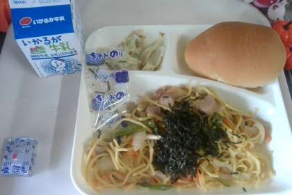 今日の献立は、ウインナーときのこの和風スパゲッティ(刻みのり)、焼きツナキャベツ、固形チーズ、ミニコッペパン、牛乳でした。ごちそうさまでした。