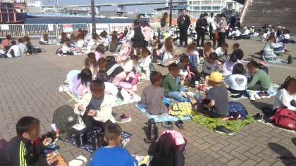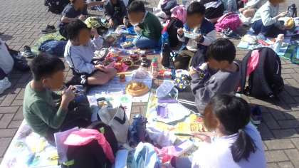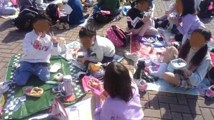 いいお天気の下、お弁当タイムです。どのお弁当もおいしそうでした。子どもたちは大喜びでおにぎりやおかずに舌鼓を打っていました。