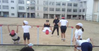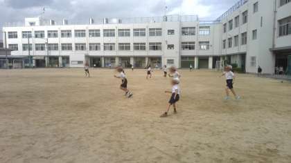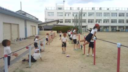 体育の学習です。鬼ごっこで運動場を走り回った後、器械運動の鉄棒運動に取り組んでいました。