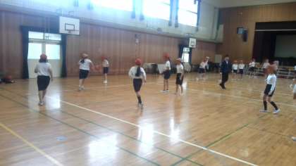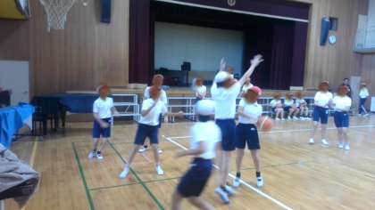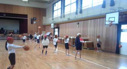 体育の学習です。バスケットボールの学習で、シュート練習の後、試しのゲームをしていました。