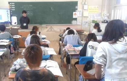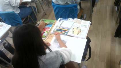 社会科の学習です。教科書の資料から、日本の工業従事人口の移り変わりについて考え、意見交流していました。