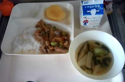 今日の献立は、ピリ辛丼、中華スープ、白桃(缶)、牛乳です。いただきます。