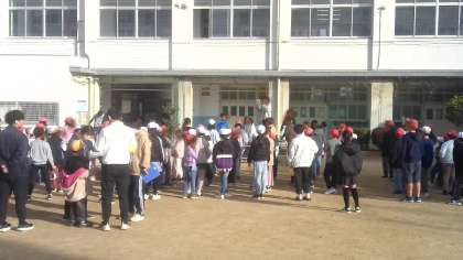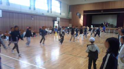 今日も運動場と体育館でフレンド集会をしました。運動場はじゃんけん列車、体育館は早歩きリレーでした。