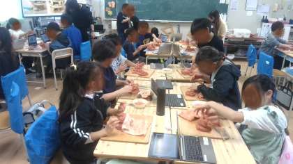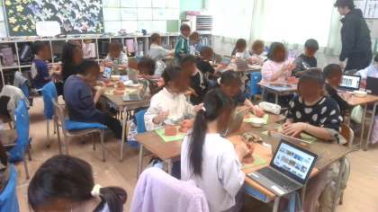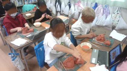 図工の学習です。粘土工作で3組ともシーサーを作っていました。粘土がすぐに乾いて固くなってしまうので、午前中のうちに一気に作成しようと頑張っていました。上段が1組、中段が2組、下段が3組の様子です。