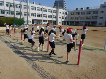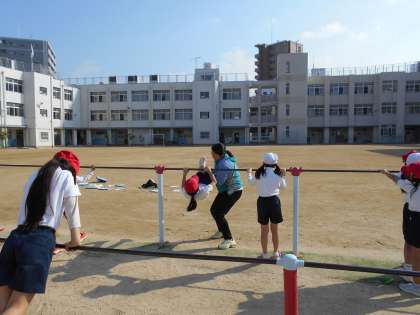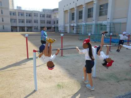 体育の学習です。器械運動の鉄棒運動をしていました。逆上がりの練習です。しっかり足を振り上げると同時に胸が鉄棒につくぐらいあげる逆上がりのコツを身につけようと、先生にも援助してもらいながら、頑張って練習していました。