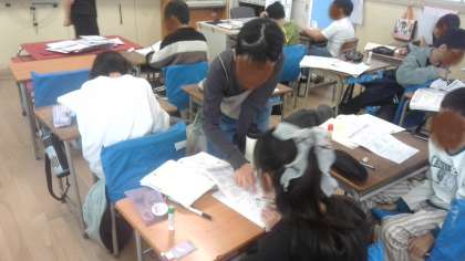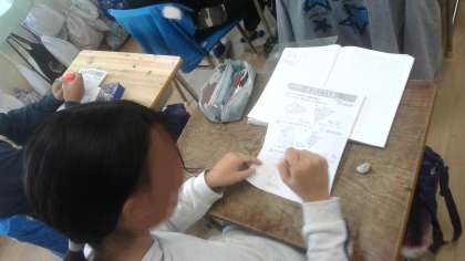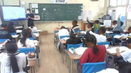 算数の学習です。今まで学習した図形の面積を求める公式を活用して、いろいろな形の面積を求めようと頑張っていました。友だちの意見を参考にしながら自分の意見をまとめ、それを発表してみんなで考えていました。