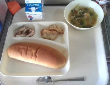 今日の献立は、揚げギョーザ、中華味噌スープ、レンコンの中華だれかけ、おさつパン、牛乳です。いただきます。