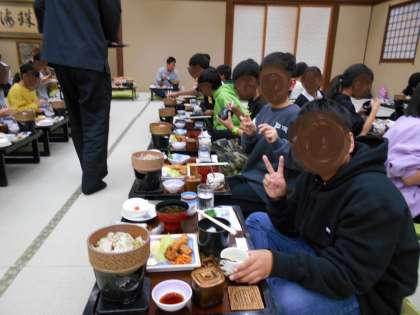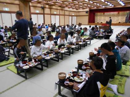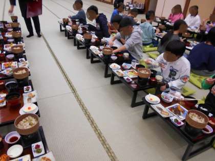 夕食の時間になりました。日中、目一杯動いたのでおなかはペコペコです。おかずの品数が多く、子どもたちはモリモリ食べていました。