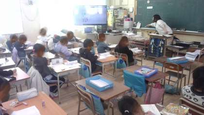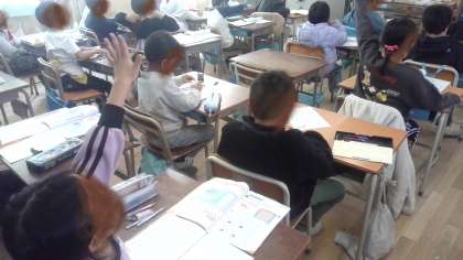 算数の学習です。九九の学習で、9の段について考えていました。例えば「9×5」について、「9+9+9+9+9」とたし算で計算してみたり、既習事項の5の段の「5×9」にひっくり返して考えてみたり、いろいろな角度から考えて理解を深めようとしていました。