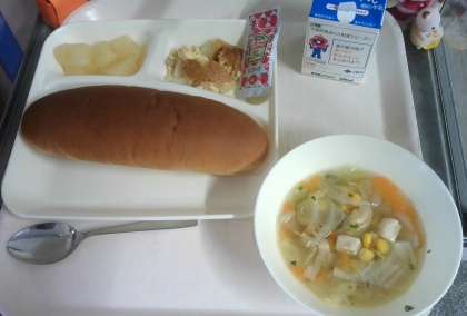 今日の献立は、ツナポテトオムレツ(ケチャップ)、スープ、洋ナシ(缶)、黒糖パン、牛乳です。いただきます。