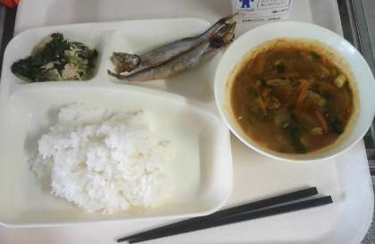 今日の献立は、焼きシシャモ、和風カレー汁、ささみと小松菜の炒め物、ごはん、牛乳でした。ごちそうさまでした。