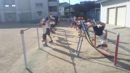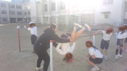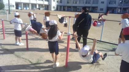 体育の学習です。鉄棒運動の学習で、逆上がりや蝙蝠振り下りなどの技の練習をしていました。先生に手伝ってもらって体の使い方を体感して自分で頑張っていました。