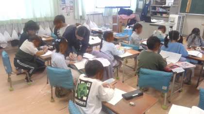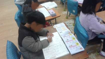 国語の学習です。漢字練習をしていました。漢字ドリルを先生に添削してもらった後、間違った漢字の反復練習をノートにしていました。一字一字丁寧に練習していました。