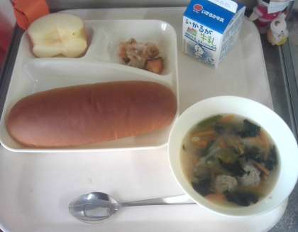 今日の献立は、鮭のマリネ、肉団子とおし麦のスープ、りんご、黒糖パン、牛乳です。いただきます。