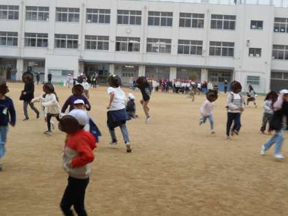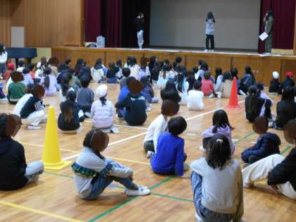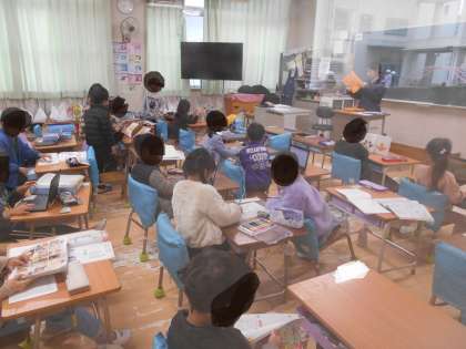 今日のフレンド集会は、運動場がけいどろ(鬼ごっこの一種)、体育館が間違い探し(舞台上で集会委員がしているゼスチャーで最初と次で違うところを見つけるクイズ)をしていました。今日の教室組は、各学年3組でした。