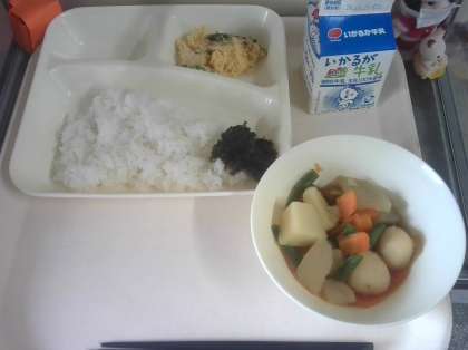 今日の献立は、卵の千種焼、まる天と野菜の煮物、海苔の佃煮、ごはん牛乳です。いただきます。