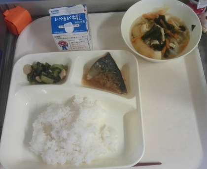 今日の献立は、サバのおろし醬油かけ、五目汁、小松菜の煮浸し、ごはん、牛乳です。いただきます。