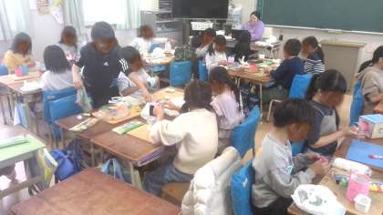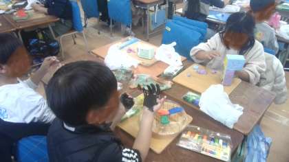 図工の学習で、家から持ってきた箱やプラスチック容器に色付けした紙粘土を付けて素敵な小物入れを作っていました。お菓子の紙箱やペットボトルなどが彩りきれいな小物入れへと変身していきました。