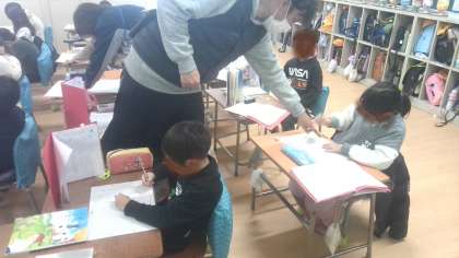 国語の学習です。前の時間に友だちに伝えたいことをワークシートにまとめる作業をしていましたが、今日は、それをもとに作文を作っていました。ワークシートの項目順に文章化していく作業を頑張っていました。