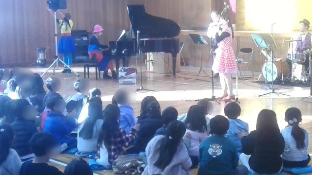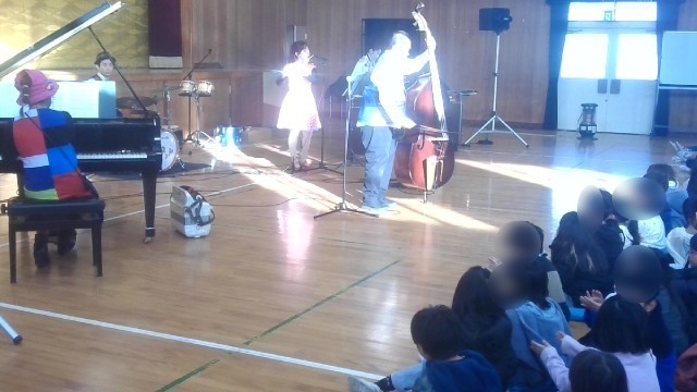 今日は、音楽鑑賞会の日です。楽団「アンサンブル レネット」に来ていただいて、いろいろな楽器を使った音楽や台所用品を使った音楽などを披露してもらいます。写真は、低学年の部の様子です。