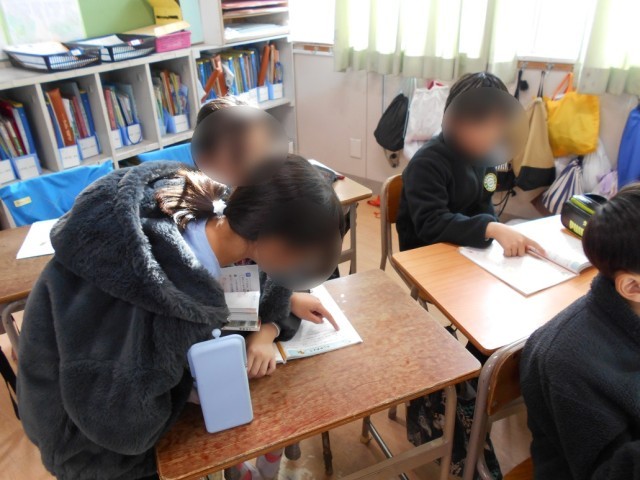 算数の学習です。分数の計算のまとめの問題に取り組んでいました。わからないところは教え合いをしていました。できたら先生に確認をしてもらっていました。