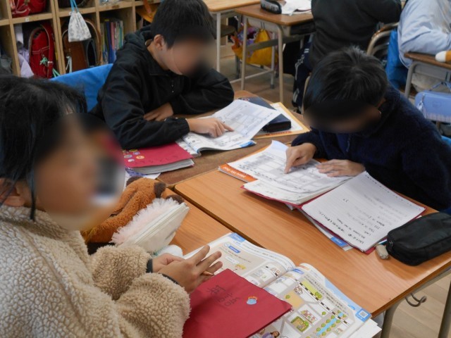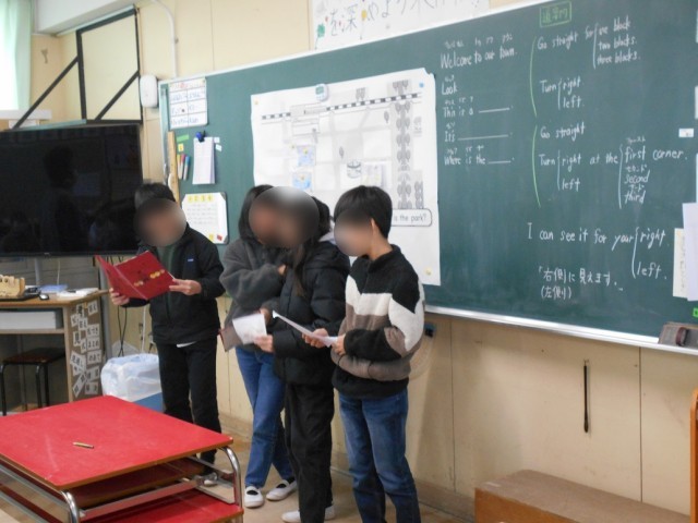 英語の学習です。地図上のポイントに英語で案内するゲームをしていました。班に分かれて、決めたポイントにうまく誘導できるよう英語で説明していました。英語を聞き取って場所がわかった人は、挙手して前の地図にポイントを貼っていました。