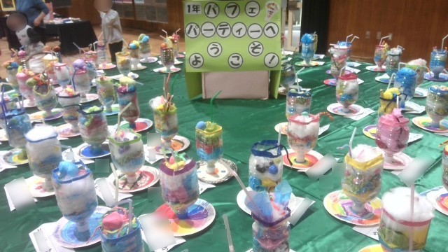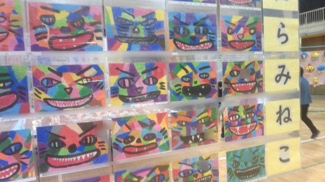 昨日から行動で作品展を開いています。立体作品と平面作品の2点を学年ごとに掲示、展示しています。懇談会にお越しの際に講堂にお寄りいただいて子どもたちの力作をぜひご覧ください(もちろん、懇談会以外でもご観覧していただけます)。写真は1年生ブースです。平面作「にらみねこ」、立体作品「パフェパーティーへようこそ(ペットボトルの容器に綿や紙粘土などで作ったフルーツやアイスをトッピングしました)」です。