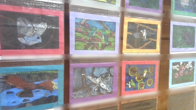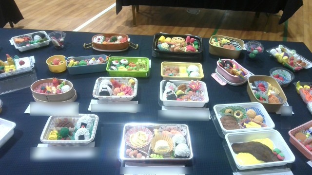 5年生のブースです。平面作品「カラフル(一版多色刷りの版画で動植物を表しました)」、立体作品は食品サンプル発祥の地の大阪にちなんで「お弁当屋さん(紙粘土でおにぎりやおかずを作り弁当にしました)」です。
