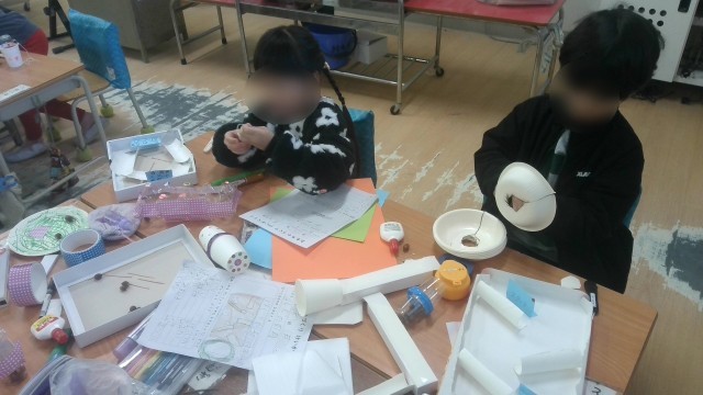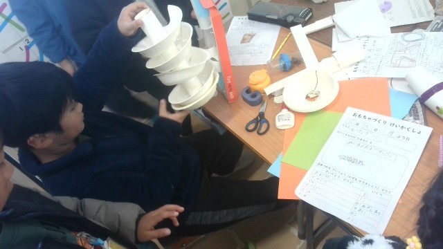 図工の学習です。紙皿や紙コップ、どんぐりなどを活用してのおもちゃ作りをしていました。事前に計画書を作ってイメージを固めてから制作に取り掛かっていました。マラカス、転がしゲーム、けん玉など楽しいおもちゃが出来上がっていました。