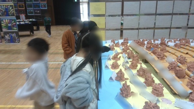 作品展の見学をしていました。他学年の作品をじっくり観賞し、「ここ上手!」「この作品かわいい」など感想を言い合っていました。