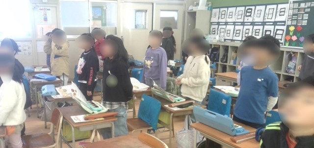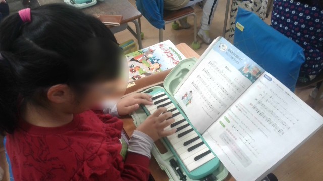 音楽の学習で「七つの子(カラス、なぜ鳴くの~の歌です)」を合唱していました。口の開け方や姿勢などに注意して合唱していました。そのあと、鍵盤ハーモニカの練習に入っていました。