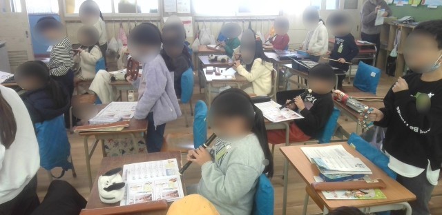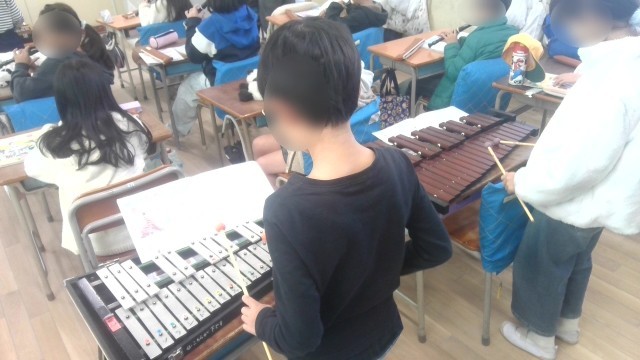音楽の学習です。「富士山」をきれいな声で合唱した後、「雪のおどり」の合奏に取り組んでいました。リコーダー、木琴、鉄琴、鈴、トライアングルなどを交代しながら演奏していました。