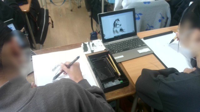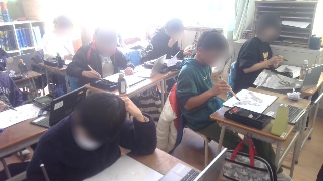 図工の学習で、水墨画に取り組んでいました。タブレット端末を使ってネットで気に入った水墨画を参考に作品を描いていました。墨の濃淡をうまく使って味わいのある作品を描いていました。