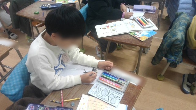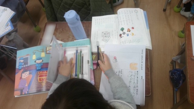 国語の学習です。友だちに紹介したい絵本を選んで、選んだ絵品のどこが気に入って選んだかを書く紹介文や気に入ったさし絵を描いた紹介プリントをつくっていました。