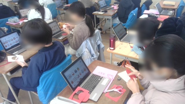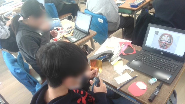 図工の学習です。来年1月の学校正門エントランスに掲示する壁面作品を作っていました。一人ひとりが個性的なだるまを作って飾ります。ネットで見つけたデザインを参考にして工夫していました。