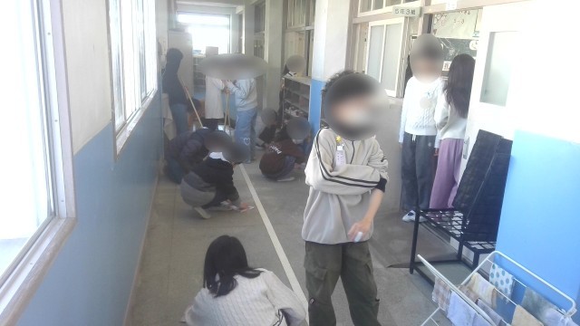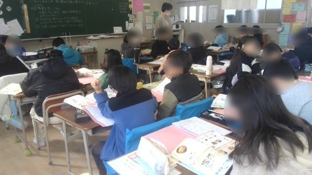 5年生の様子です。上段の1組はお楽しみ会ですね。クイズコーナーのようです。中段の2組は家庭科で、3学期早々に予定している調理実習に向けた学習でした。下段の3組は大掃除。教室や教室前廊下をきれいにしていました。