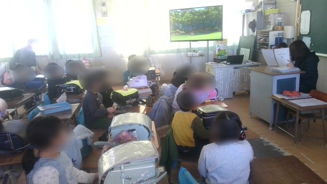 上段の1組は、「ふゆやすみのくらし」を見ながら冬休みの過ごし方について先生からお話を聞いていました。中段の2組は通知表を受け取っていました。待っている人はビデオ鑑賞でした。げっだんの2枚は3組です。廊下で通知表を受け取りながら先生のお話を聞きました。待っている人は、教室で「ふゆやすみのくらし」の色塗りをしていました。