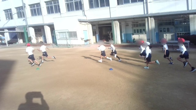 体育の学習です。1時限目で朝の陽差しの下、持久走をしていました。気持ちよさそうでした。5分間の持久走の後は、ボールゲームの練習をチームでしていました。