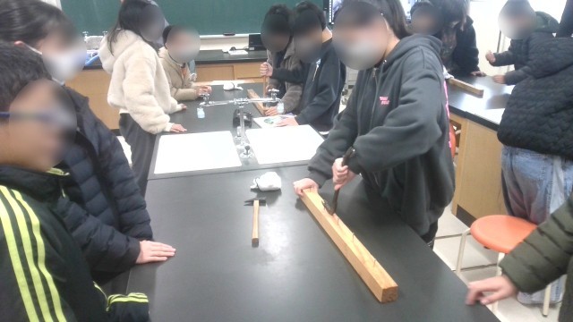 理科で、「てこ」について学習していました。てこの原理を身近な道具を使って体感していました。木に打ち込んだ釘を手で抜こうとする時とバールを使って抜こうとする時とを比べる実験でした。手だけではどんだけ力を入れても全然抜けない釘がバールを使うと力をそんなに使わずに比較的簡単に抜けることを実感して「てこ」に興味をもち、調べていこうという意欲をわかせていました。