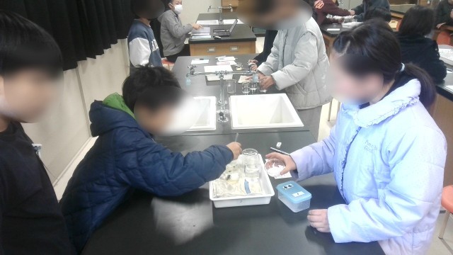 理科の学習です。「もののとけ方」の単元です。「ものがとける」とはどういうことなのかを考えるための実験をしていました。食塩、砂糖、小麦粉の3つを同じ量の水にいれてかき混ぜ、その様子を観察していました。実験後、みんなで結果を考察し、そこで「食塩を入れたビーカーの水は無色透明で、食塩の粒が残っていない」「砂糖を入れたビーカーの水は少し黄色くなっているあ、透明である」「小麦粉を入れたビーカーには時間がたってくると底に白い粉が出てきた」などの意見が出ていました。実験の結果とまとめから、ものが水に溶けるとは「水に入れたものが見えなくなっている。水が透明になっている。時間がたってもとけたものが水底に出てこない。」などの条件を満たしていることだと知りました。