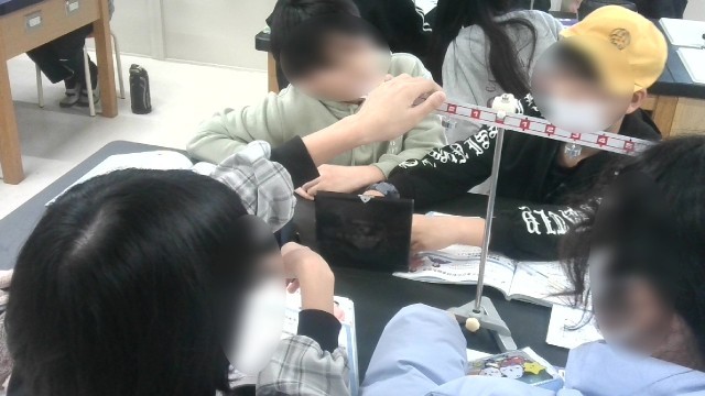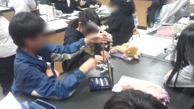 理科で、てこについての学習です。てこの原理を学んだあと、実験用てことおもりを使って、支点と作用点との距離とおもりの重さを変えててこが釣り合って平行になる組み合わせを調べていました。