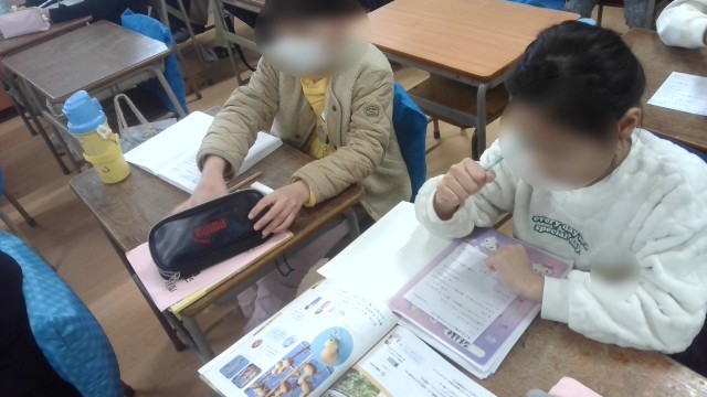 冬の生き物の様子についてのまとめのプリントに取り組んでいました。学習したことをしっかりと思い起こして空欄を埋めようと頑張っていました。なかなか思い出せないところは教科書を参考にしてもよかったようです。